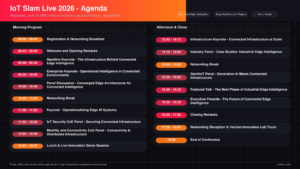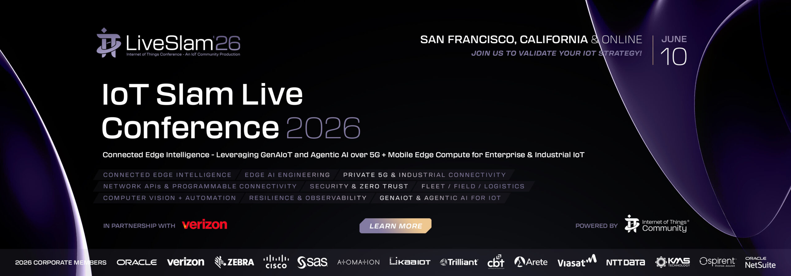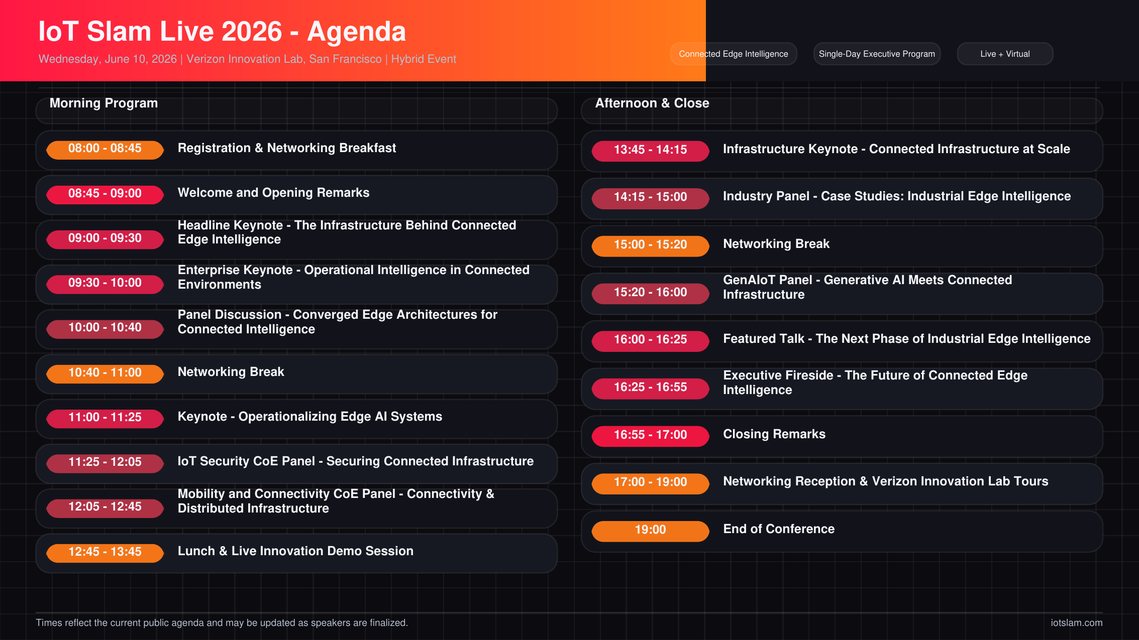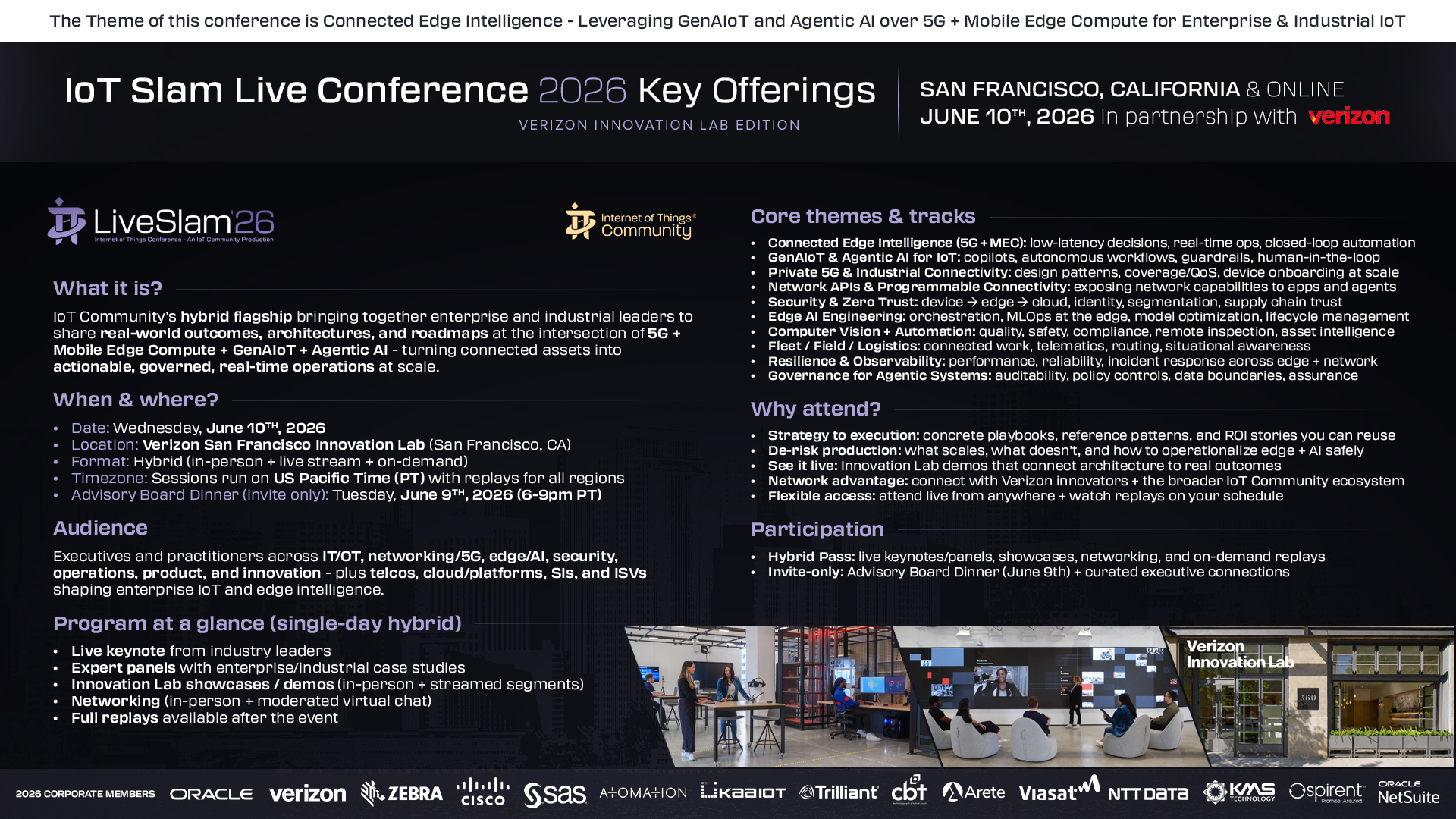 IoT Slam Live 2026 is a one-day executive program focused on Connected Edge Intelligence, AIoT, secure infrastructure, and real-world deployment. Hosted at the Verizon Innovation Lab in San Francisco and available online, the event brings together leaders from across the ecosystem for high-value discussion, practical insight, and meaningful networking.