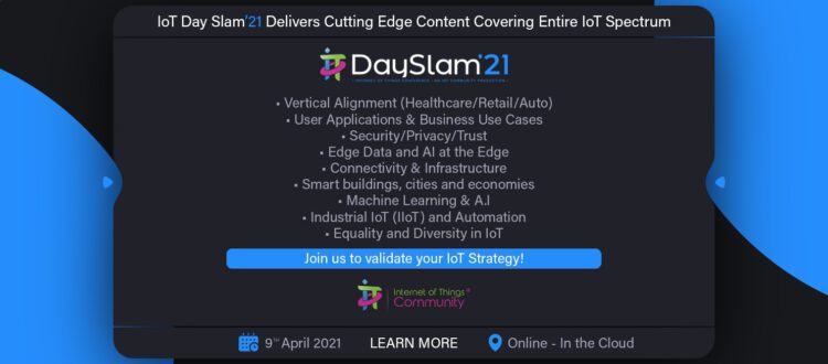 The IoT Day Slam 2021 is the Internet of Things Community’s fourteenth international conference, held in celebration of World IoT Day 2021, covering a horizontal industry perspective, across the entire spectrum of IoT. The IoT Slam 2021 takes place April 9th, 2021 virtually in the cloud. Details at: https://iotslam.com