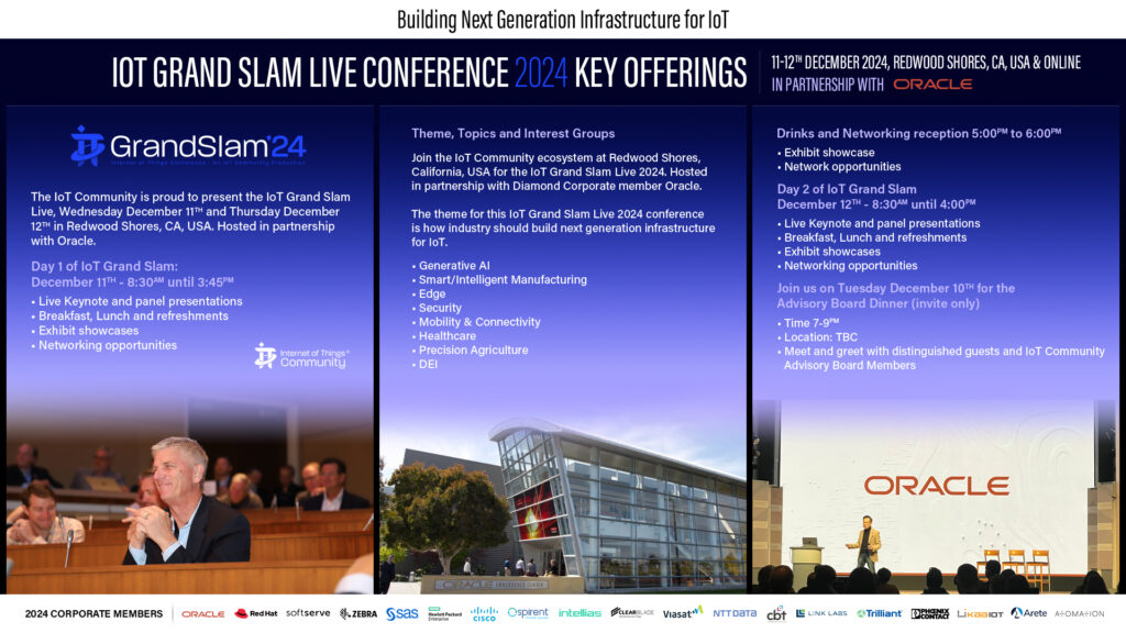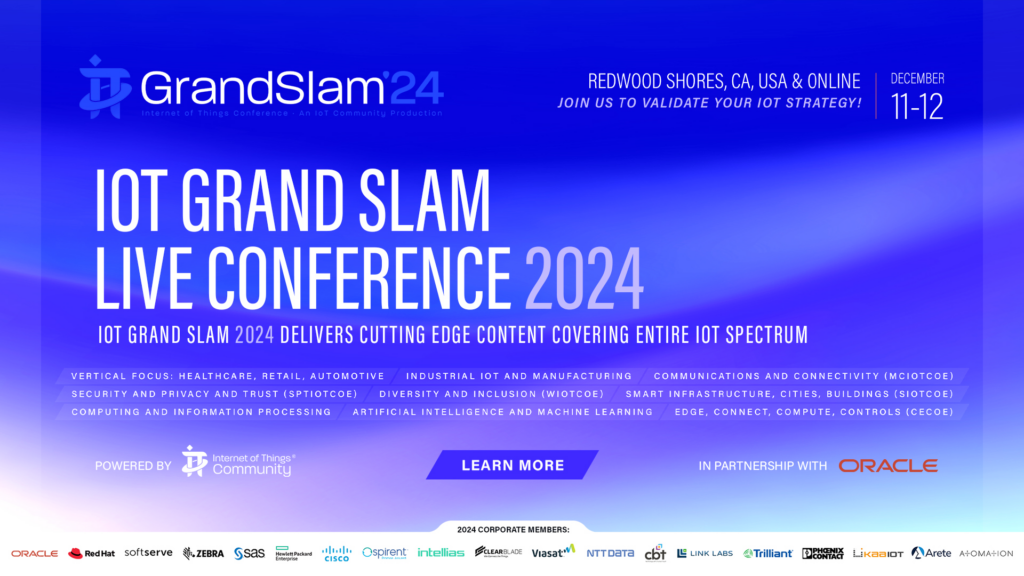 The Second Annual IoT Grand Slam Live 2024, will be held in Silicon Valley, CA, at the Oracle Conference Center, Redwood Shores and broadcast online