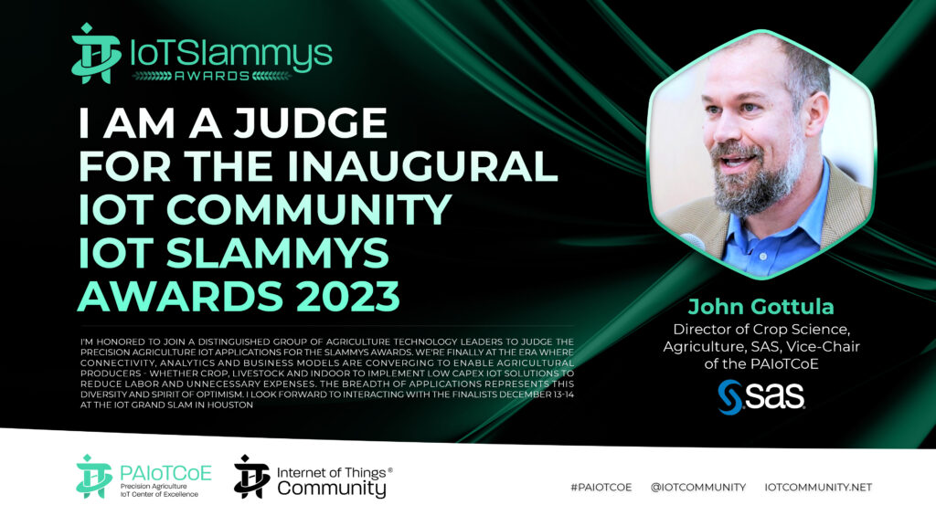 I’m honored to join a distinguished group of agriculture technology leaders to judge the Precision Agriculture IoT applications for the Slammys Awards. We’re finally at the era where connectivity, analytics and business models are converging to enable agricultural producers – whether crop, livestock and indoor to implement low CapEx IoT solutions to reduce labor and unnecessary expenses. The breadth of applications represents this diversity and spirit of optimism. I look forward to interacting with the finalists December 13-14 at the IoT Grand Slam in Houston.