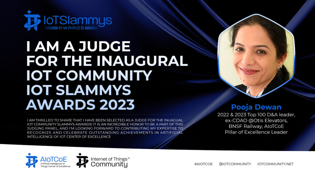 6 Nov IoT Slammys 2023 Judge – Pooja Dewan Pooja Dewan – 2022& 2023 Top 100 D&A leader l ex-CDAO @Otis Elevators, BNSF Railway AIoTCoE Judge 2023