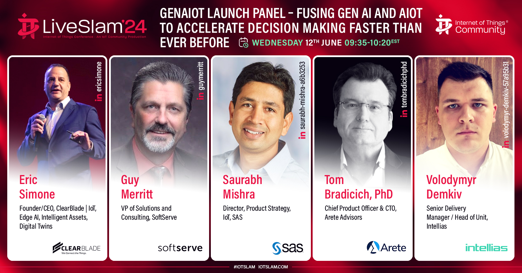 What do you get when you fuse Generative AI with AIoT? GenAIoT. Dr Tom Bradicich, IoT Community Board Chair, will moderate a panel featuring founding members of this recently launched, industry solution category. Join SAS, SoftServe, Intellias and ClearBlade for an engaging panel outlining real-world opportunities associated with this transformative intersection of Gen AI and AIoT – a market estimated to be a mega-value creator topping 4.5 Trillion USD by 2030.