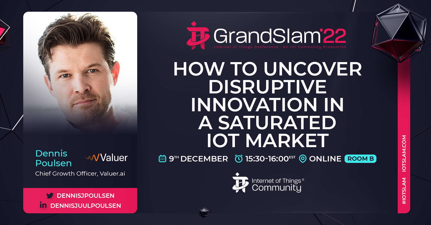 By the end of 2022, $1 trillion will have been spent on IoT technology. This growth is predicted to continue, year on year. On just this statistic alone, one could conclude that the IoT Market is flooded with new innovations and those interested in acquiring those innovations. So how does one stay competitive? How does one uncover disruptive innovation in a saturated IoT market? In this talk, Dennis Poulsen, Chief Growth Officer of Valuer.ai, looks at the conventional methods for discovering new innovation and compares that with the potential of AI and its ability to make search more semantic—and arguably more human-like—can bring to the table.