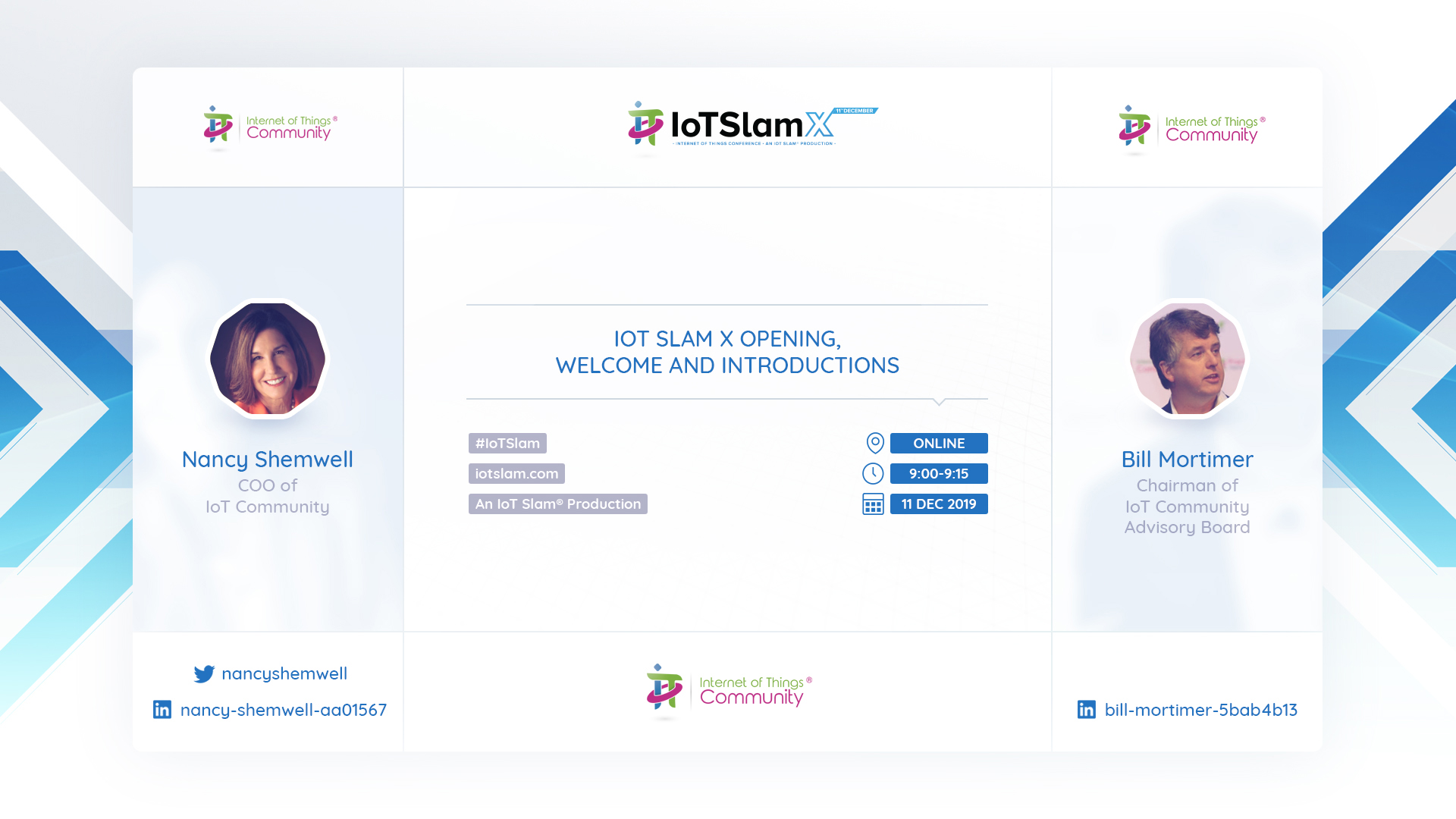 A welcome and introduction to the Tenth IoT Slam conference, by IoT Community Advisory Board Chairman Bill Mortimer, and COO, Nancy Shemwell, who will provide an update on current conditions for our IoT Community members, as well as set the stage for the rest of the event format as a whole.